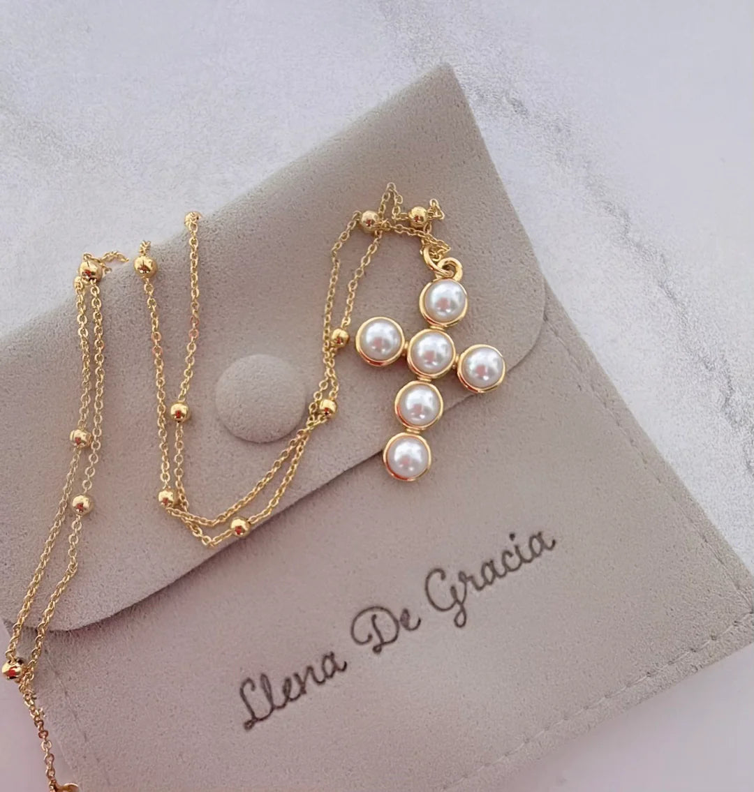 This elegant necklace features a delicate pearl cross pendant set in a 14K gold-plated bezel. A beautiful and meaningful accessory symbolizing faith, grace, and devotion.