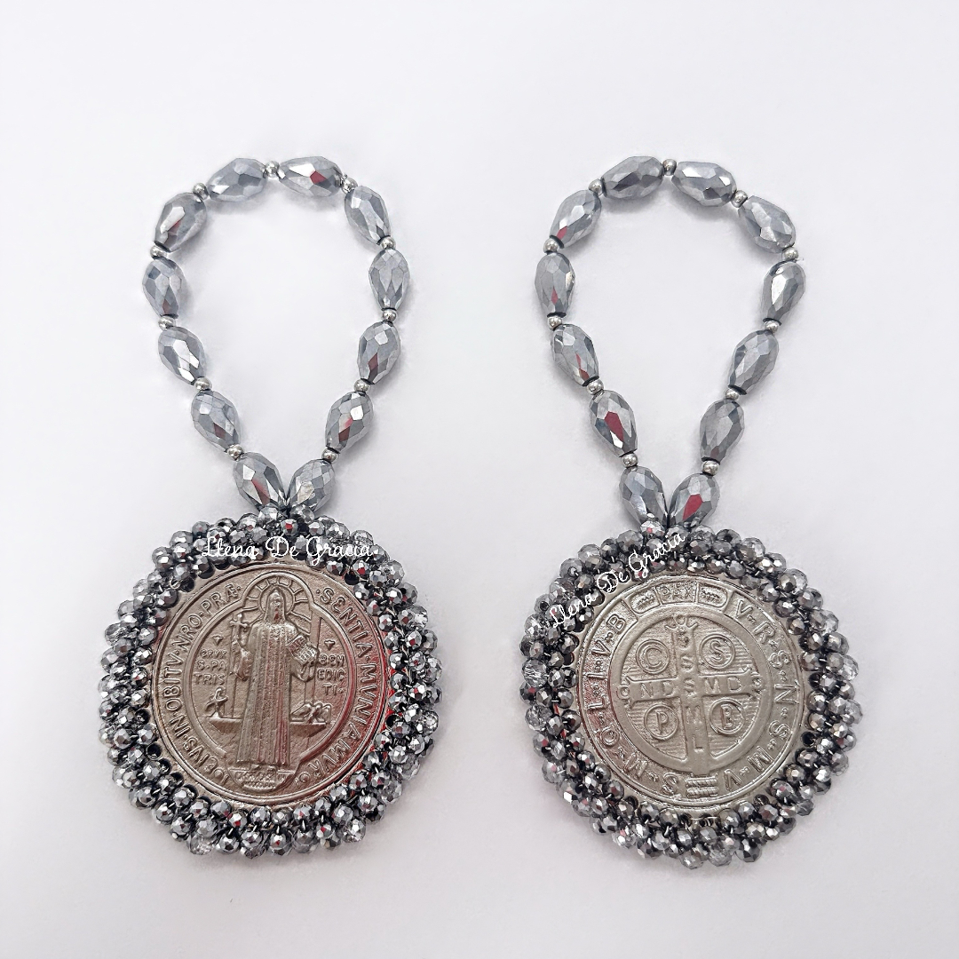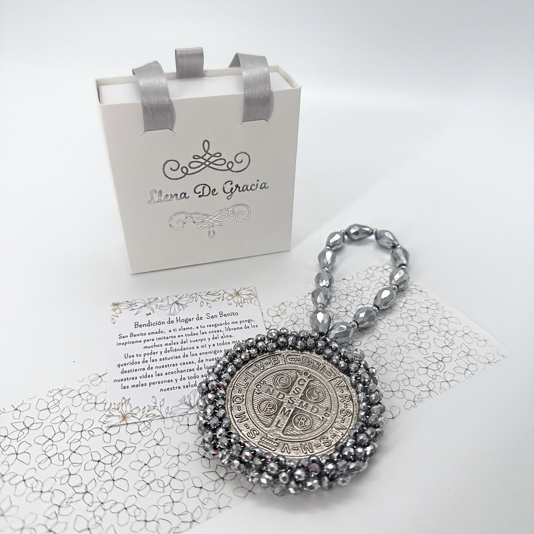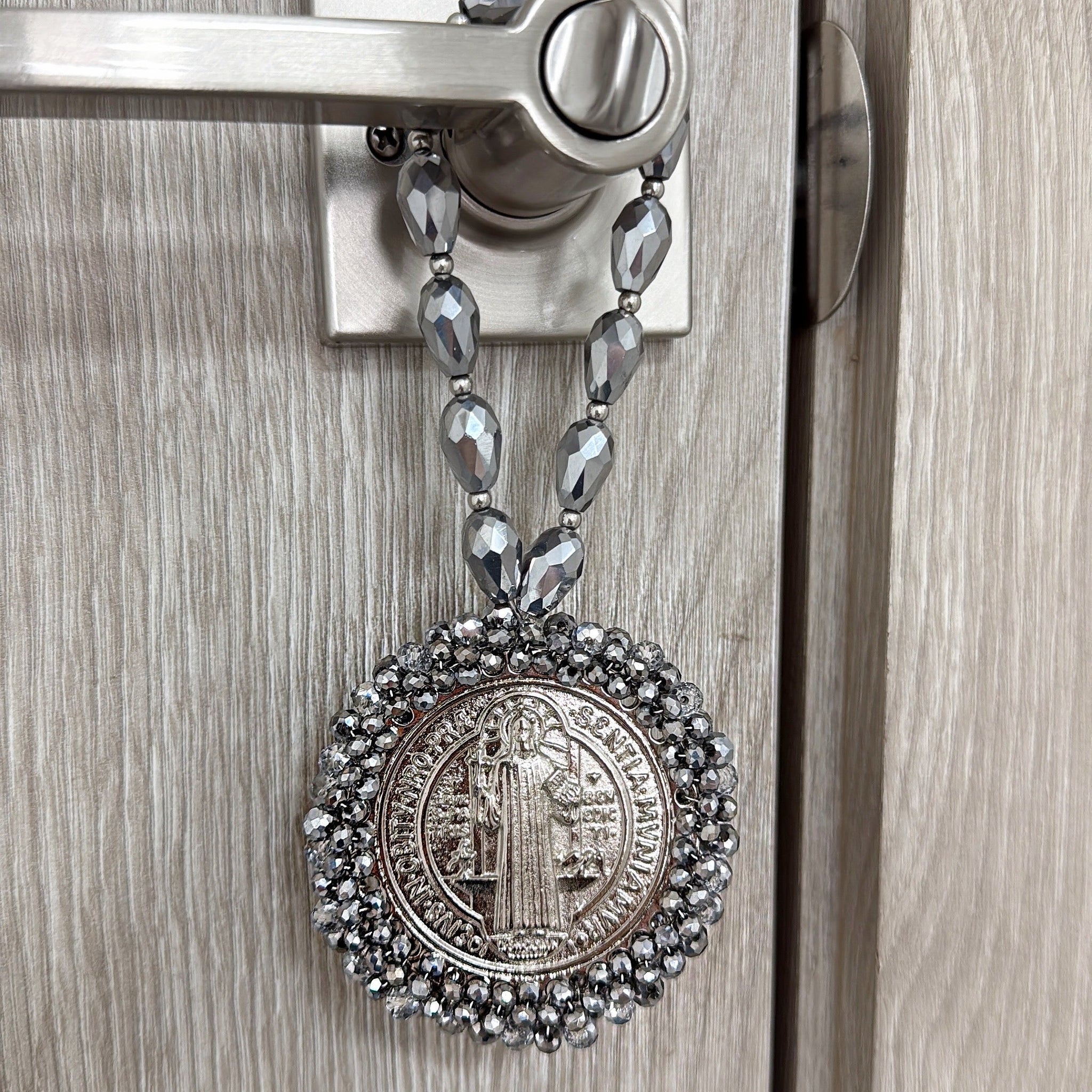 This elegant St. Benedict Home Blessing medal is hand- crafted in stainless steel with a rhodium finish and beautifully accented with cristal beads.